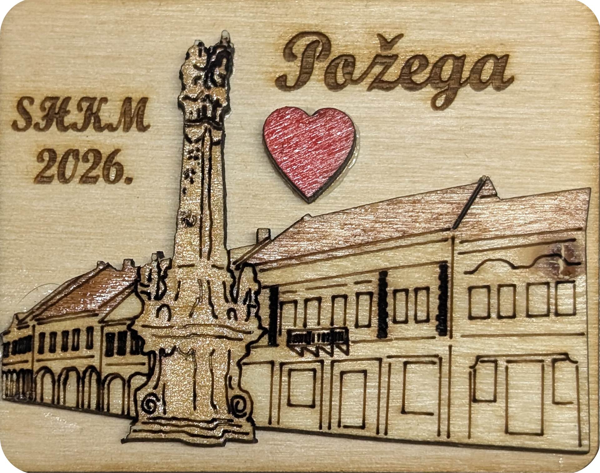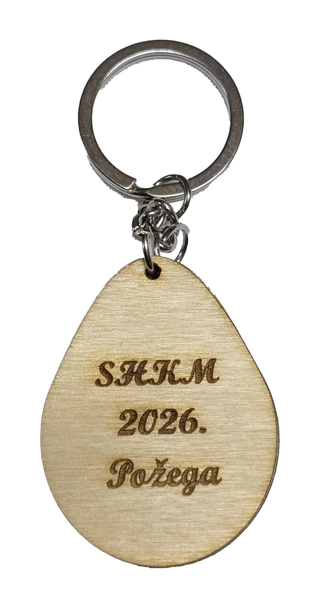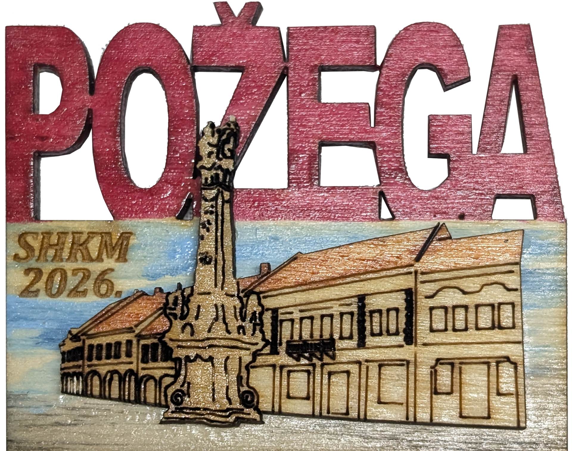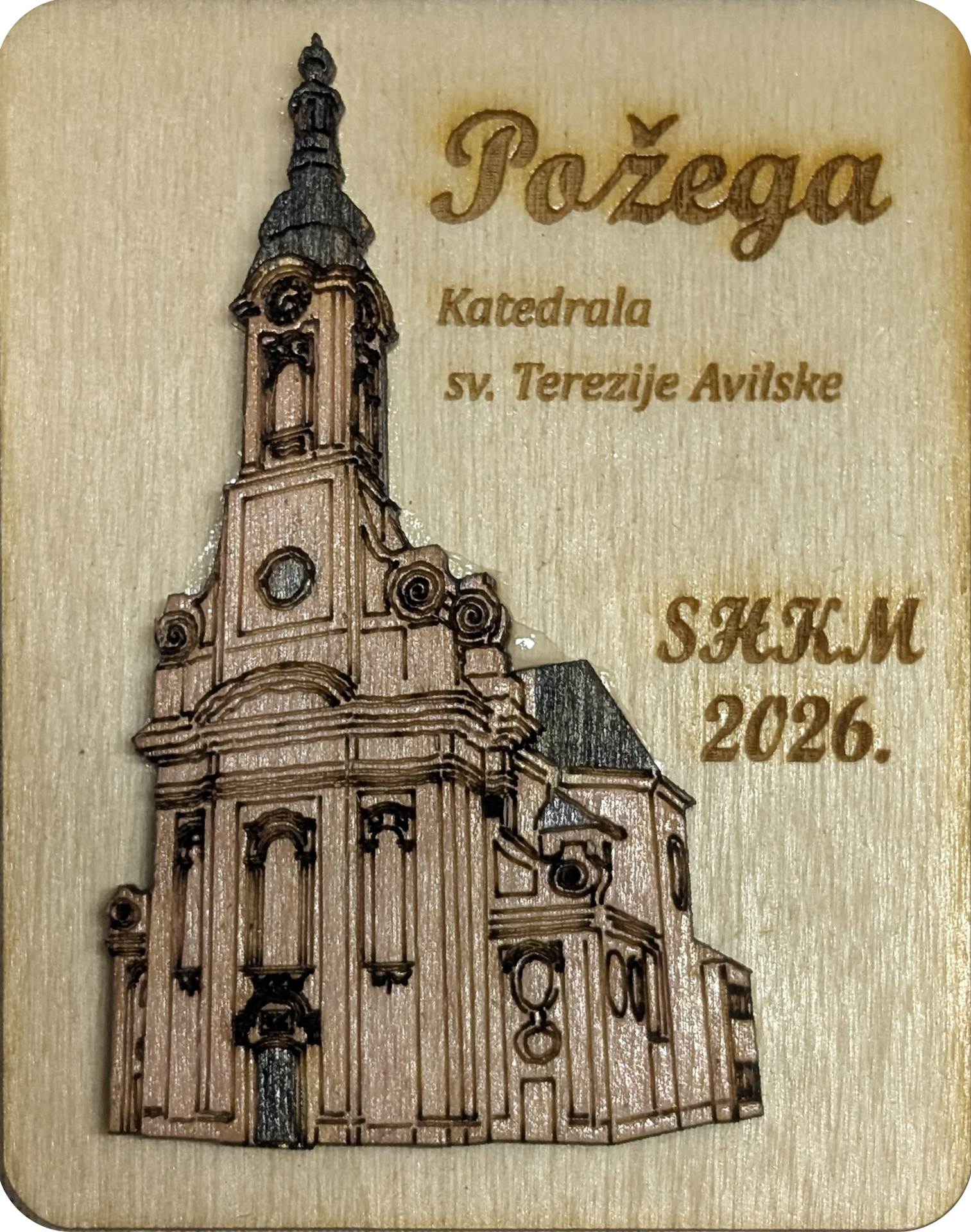 Kao trajna uspomena na Susret hrvatske katoličke mladeži 2026., dostupni su ručno izrađeni drveni privjesci i magneti s motivima grada Požege, Požeške biskupije i požeške katedrale.