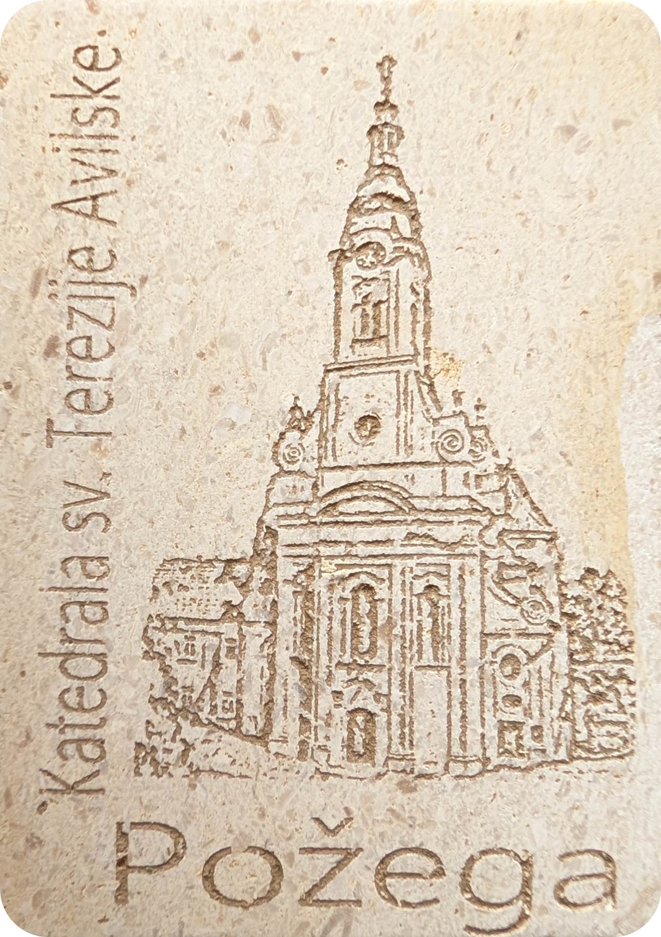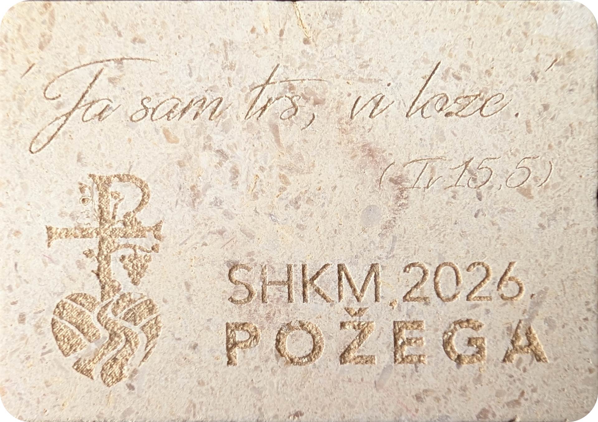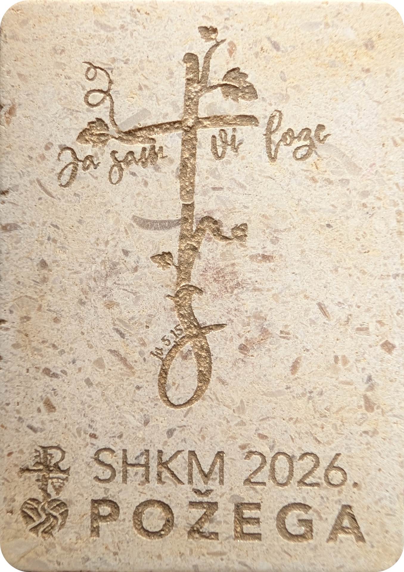 Izrađen od prirodnog rezanog kamena iz Republike Hrvatske, posebnom tehnikom graviranja s izraženim kontrastom, dodatno istaknutim prirodnom zemljom sa slavonskih polja. Svaki je primjerak unikatan, jer struktura i tekstura kamena nose vlastitu prirodnu posebnost – trajni podsjetnik na Susret i zajedništvo mladih.