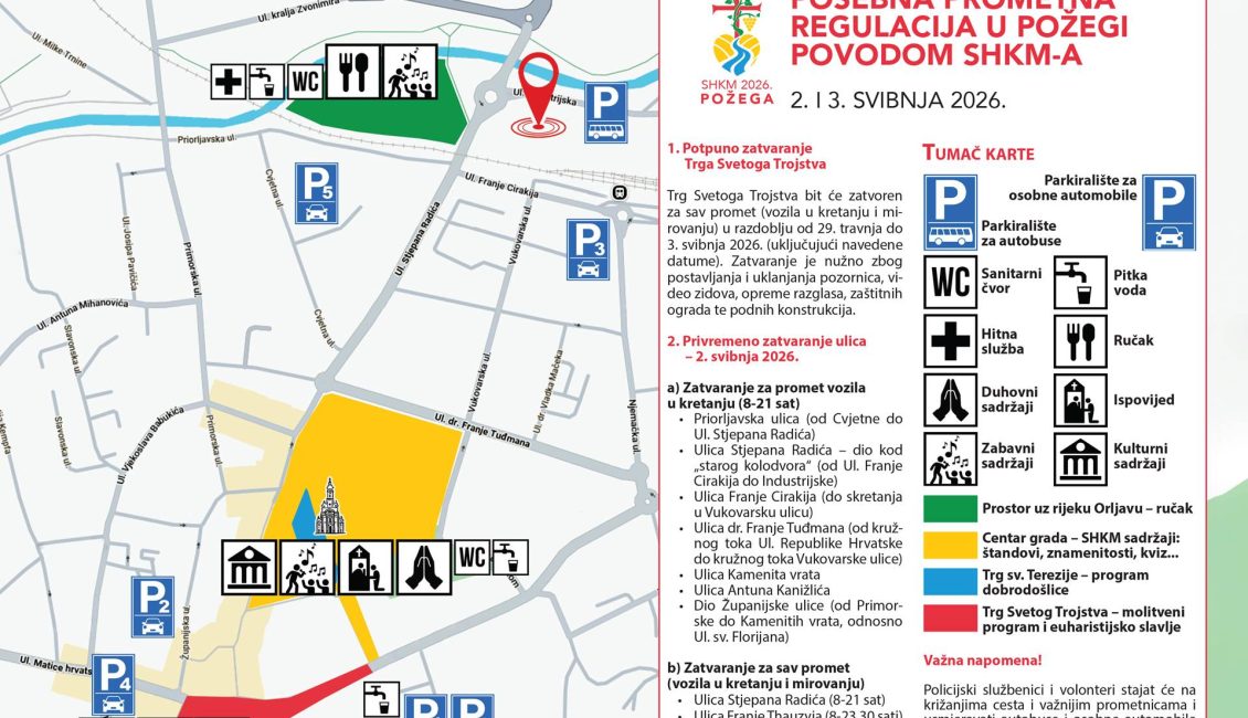 Povodom održavanja Susreta hrvatske katoličke mladeži (SHKM) u Požegi, a radi osiguranja sigurnosti sudionika i nesmetane organizacije događaja, obavještavamo vas o privremenoj posebnoj regulaciji prometa koja se provodi uz odobrenje Grada Požege i Policijske uprave Požeško-slavonske. Ljubazno molimo građane grada Požege za razumijevanje i strpljenje tijekom trajanja ovih mjera.
